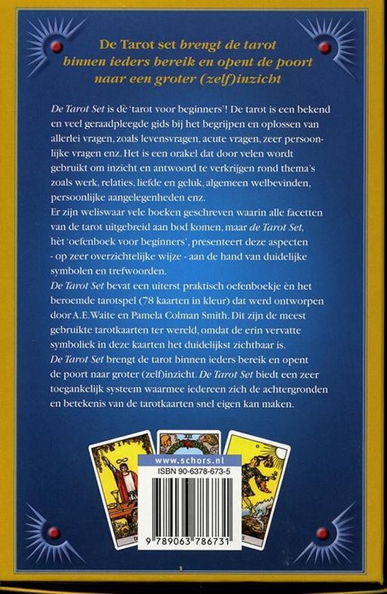 Dit zijn de meest gebruikte tarotkaarten ter wereld, omdat de erin vervatte symboliek in deze kaarten het duidelijkst zichtbaar is. De Tarot Set brengt de tarot binnen ieders bereik en opent de poort naar groter (zelf)inzicht. De Tarot Set biedt een zeer toegankelijk systeem waarmee iedereen zich de achtergronden en betekenis van de tarotkaarten snel eigen kan maken.