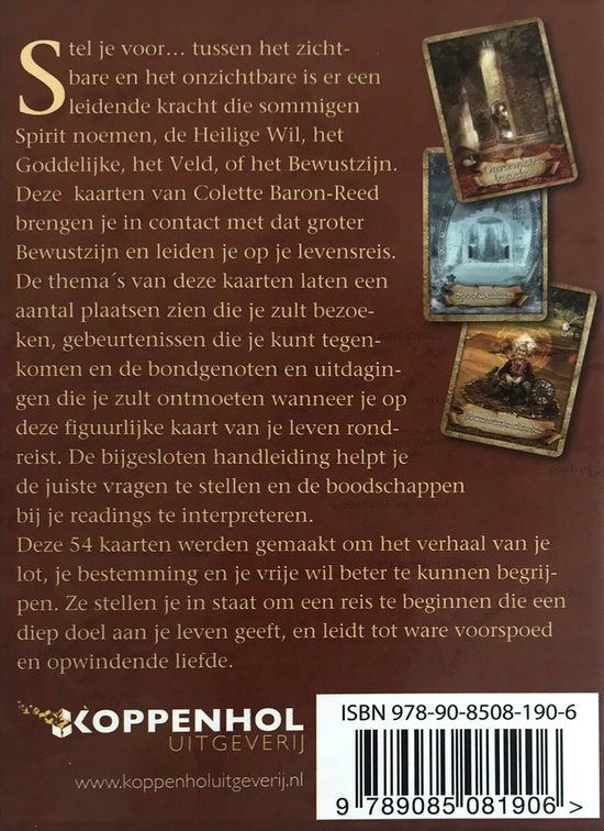 Deze kaarten van Colette Baron-Reed brengen je in contact met dat groter Bewustzijn en leiden je op je levensreis. De thema´s van deze kaarten laten een aantal plaatsen zien die je zult bezoeken, gebeurtenissen die je kunt tegenkomen en de bondgenoten en uitdagingen die je zult ontmoeten wanneer je op deze figuurlijke kaart van je leven rondreist. De bijgesloten handleiding helpt je de juiste vragen te stellen en de boodschappen bij je readings te interpreteren.